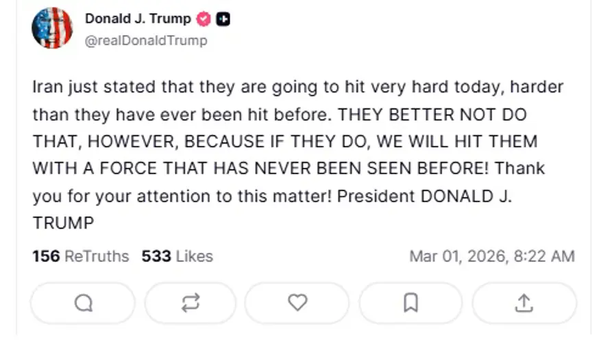 ABD Başkanı Donald Trump toplumsal medya platformu Trurth üzerinden İran'a ileti verdi. İran'ın yepyeni saldırılar yapacağını açıklamasının ardından Trump, "Bunu yapmamaları iyice olur eğer yaparlarsadaha önce hiç görüşmemiş tek güçle onlara karşı geleceğiz". ifadelerini kullandı. İran Parlamentosu sözcüsü Kalibaf da Trump ve İsrail Başbakanı Netanyahu'yu hedefleri aldı. Kalibaf, ikisi liderin da "kırmızı çizgiyi geçtiğini ve bunun hesabını vereceklerini" söyledi. Kalibaf, İran devletleri televizyonunda Hamaney sonrası senaryoları da ele aldı ve "Hamaney'in yolundan devam edeceğiz" dedi. Kalibaf, İran'ın tüm senaryolara hazırlıklı olduğunu ifadeleri etti.
