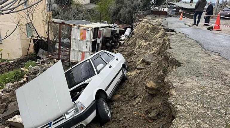 Sazlı Mahallesi'nde da yağış sonrası istinat duvarının çökmesi sonucu parklar halindeki kamyonet ve otomobilde zarar oluştu.