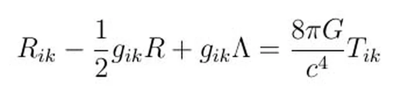Burada sol taraf GikG_{ik}'nin açık halini ifadeleri eder. RikR_{ik} terimi Ricci eğrilik tensörü, gikg_{ik} metrik tensör, RR eğrilik skaleri, ΛΛ ise kozmolojik sabittir. Bazen Einstein saha denklemlerinin kozmolojik sabitsiz halini da görebilirsiniz.