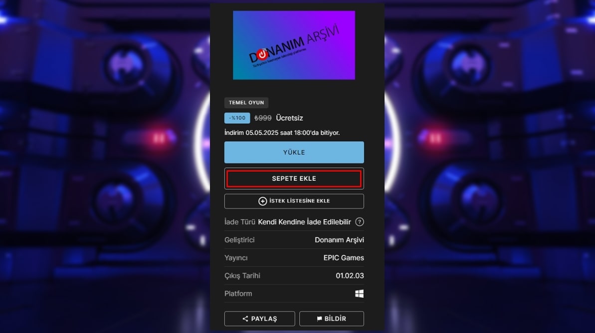 - “Yükle” ya da “Sepete Ekle” butonunu kullanarak Epic Games’in ücretsiz olarak verdiği oyunu sepetinize ekleyin.