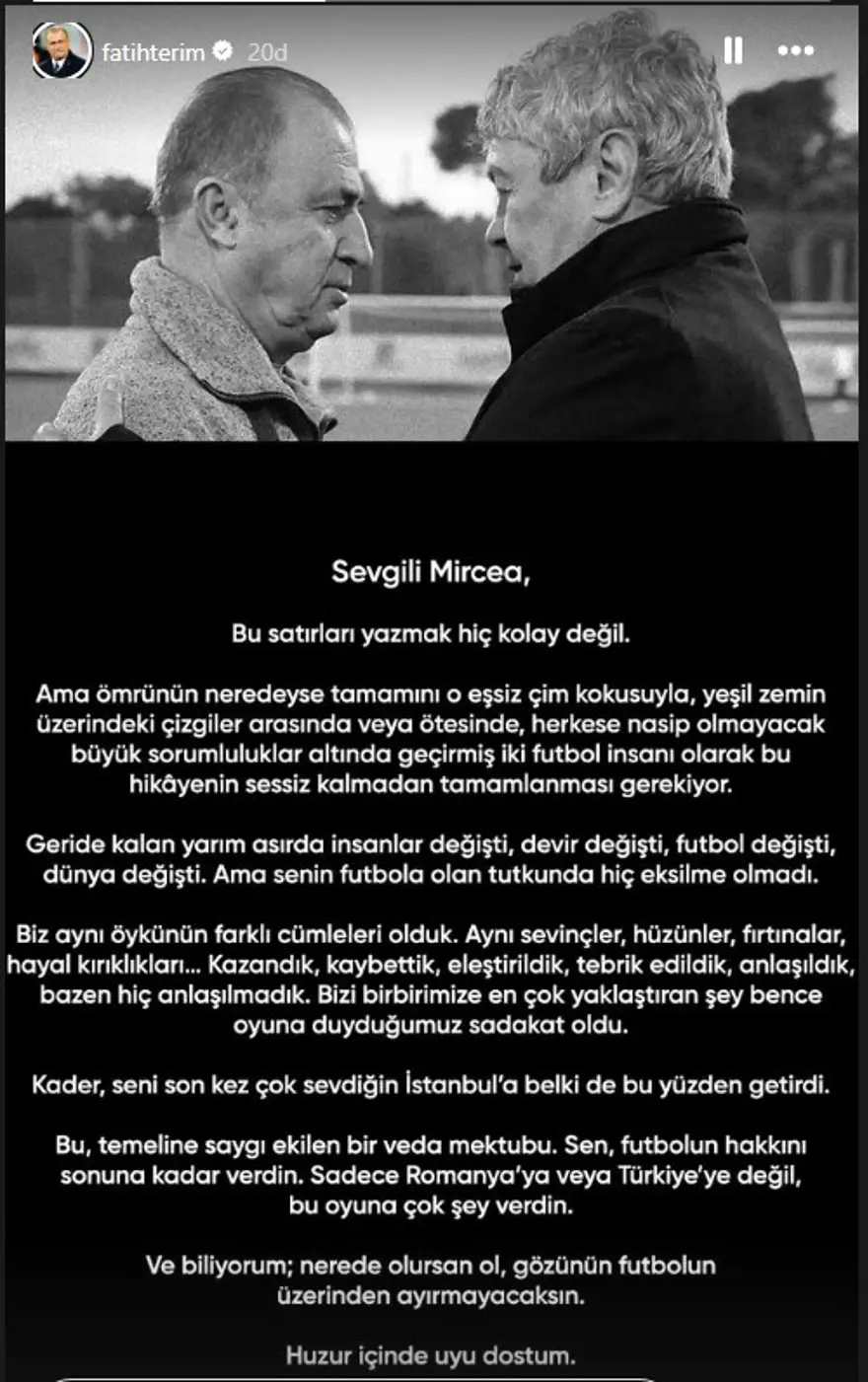 Teknik direktör Fatih Terim, hayatını kaybeden Mircea Lucescu'ya toplumsal medya hesabından yaptığı paylaşımla veda etti.