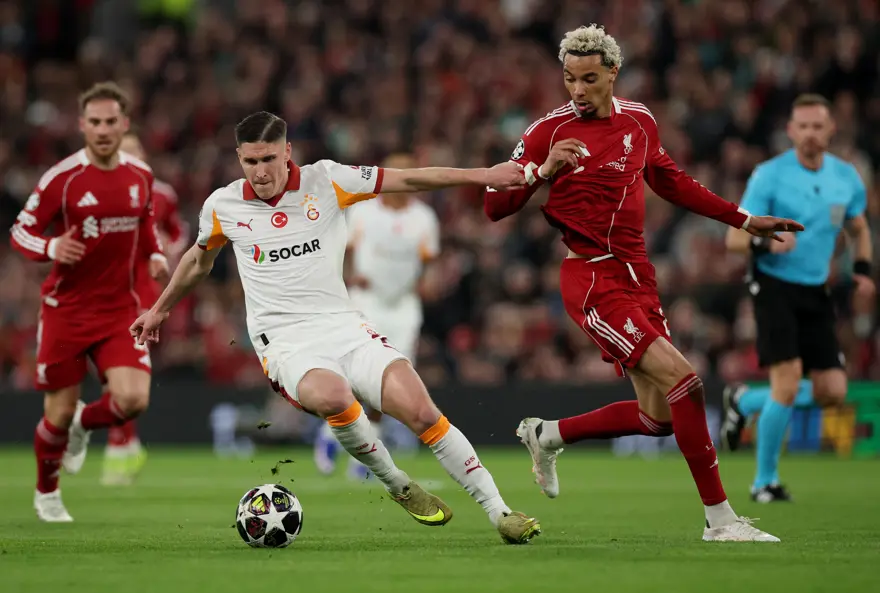 Liverpool'dan Ekitike ve Galatasaray'dan Sacha Boey'in ikili mücadelesi.