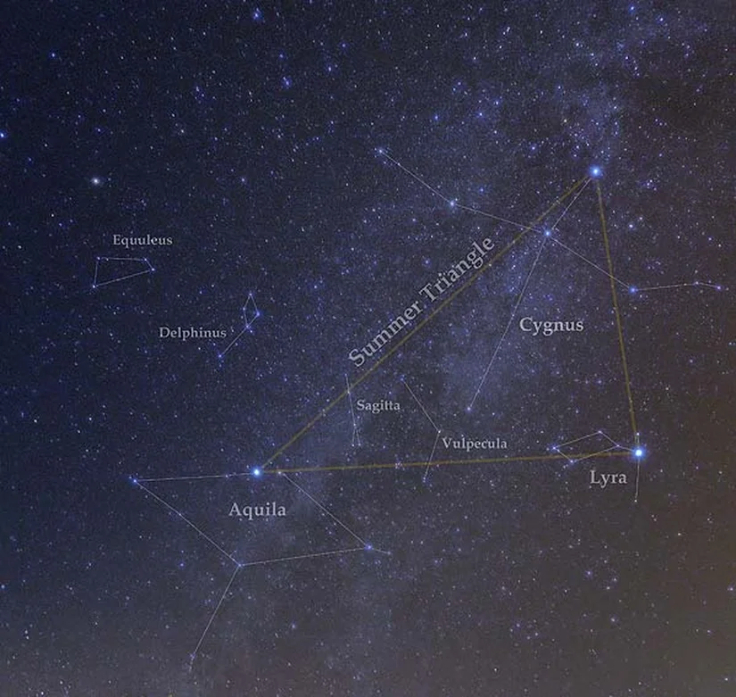 Yukarıdaki görselde ise yazları üçgenini görmekteyiz. Genelde yazları aylarında geceleyin saatleri gökyüzünde yükselti noktasına oldukça yakın tek bölgede, geniş tek alanı kaplarlar. Fark etmesi oldukça basitdır. Buradaki görselde Lyra takım yıldızının en ışıltılı üyesi α Lyr olan Vega yıldızı (sağ altta), Aquila takım yıldızının en ışıltılı üyesi α Aql diğer Altair (solda altta) ve Cygnus takım yıldızının en ışıltılı üyesi α Cyg diğer Deneb yıldızı (üstte sağda) görülmektedir.