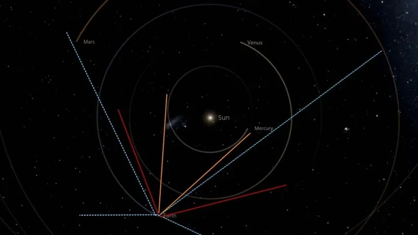 Yukarıdaki görselde turuncu ile Merkür'ün, kırmızı ile Venüs'ün, mavi kesikli çizgi ile Mars'ın yörüngesi üzerinde nerelerde görünebileceğini görebilirsiniz. Merkür çok kısıtlı tek aralıkta görülebilirken Venüs dahaaz daha geniş tek aralıkta görülevakıf olmaktedir. Fakat Mars, Jüpiter, Satürn, Uranüs ve Neptün laf yerindeyse arkamıza dolanabildiklerinden ötürü, gökyüzünde çok daha geniş tek alanda bulunavakıf olmaktedirler.