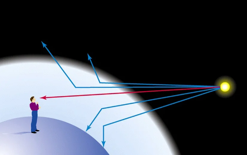 Güneş'ten aldığımız beyazlı ışık, her arasında biri dalgalı boyundan ışığı içerisinde barındırır. Atmosferimizden geçen bu beyazlı ışığın içerisindeki farklı dalgalı boyuna malik ışıkların her arasında biri biri atmosferde farklı açılarla kırılır. Bazıları atmosferin yapısından ötürü soğurulur ya da saçılır. Gökyüzünün mavi görünmesinin sebebi da mavi ışığın atmosferimizde oldukça fazla saçılmasından kaynaklanır.