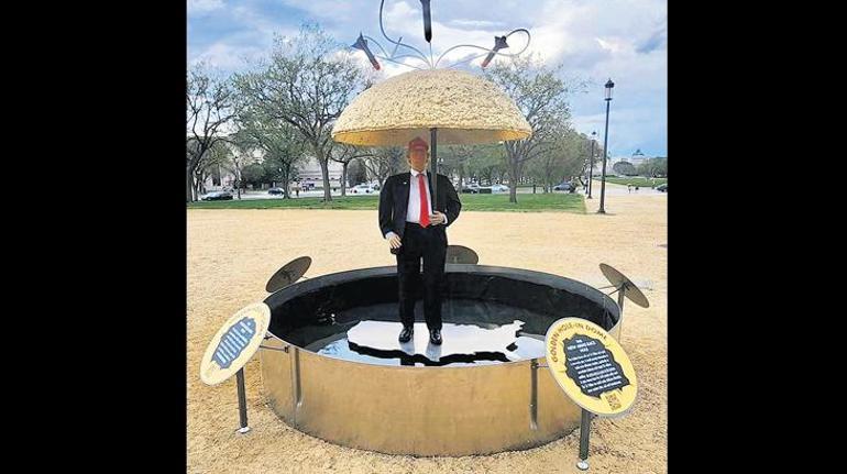 Washington’da tek parka başlıklan, dondurma devi Ben&Jerry’s firmasının kurucu ortaklarından arasında biri tarafından yapılan bu eser, ABD Başkanı’nın açıkladığı ve “hayal mahsulü” olarak görülen “Altın Kubbe” müdafaa sistemiyle dalgalı geçiyor. dThe Independent