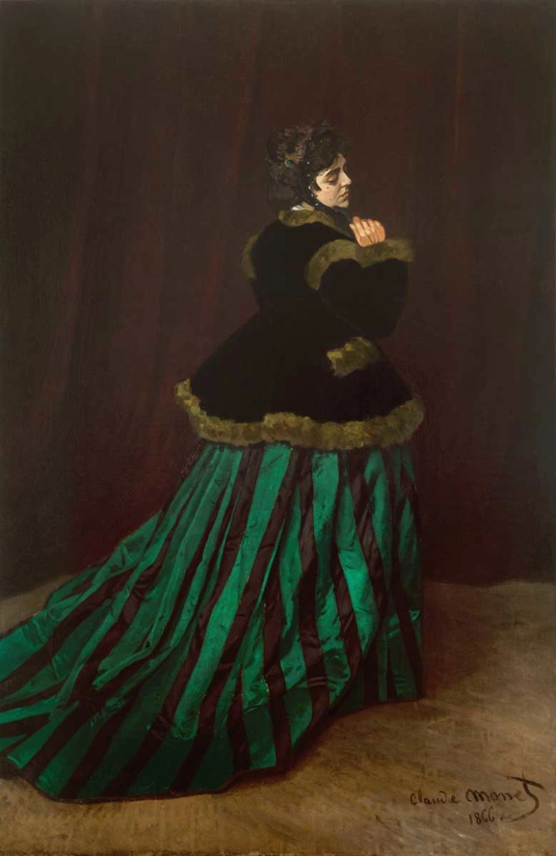 Bu eser, Monet’nin kariyerinin erkenden dönemlerinde ilgi çekmesini sağlayan tablolardan biridir. Camille’in yeşil elbisesiyle betimlendiği tablo, dönemin koridor resimlerine kıyasla daha dinamik ve modern tek kompozisyona sahiptir. Figürün kadrajdan taşar gibi durması ve elbisenin hareket hissi, Monet’nin klasik tablo anlayışından uzaklaştığını gösterir. Bu tablo, sanatçının akademik başarı ile yenilikçi yaklaşım arasında kurduğu dengeyi gözler önüne serer.