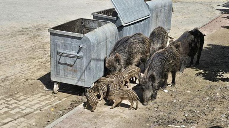 Gazibeğendi bölgesine gelen yaban domuzu ve yavruları, çöp konteynerlerinin çevresinde besin aradı.