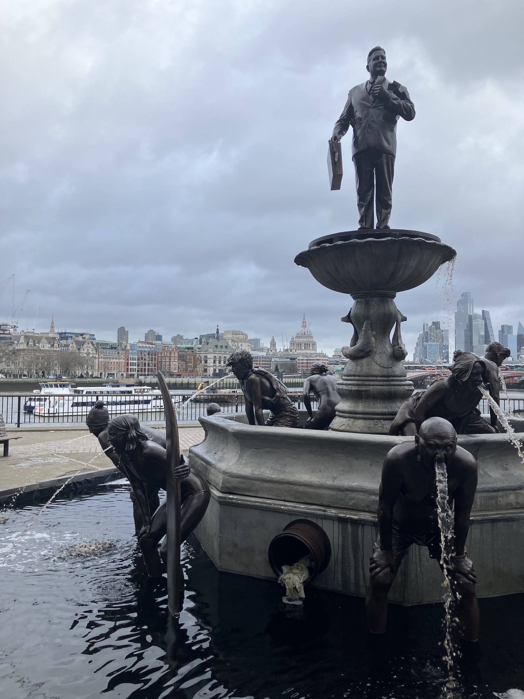 Kamera önüne mazi bronz heykeller; erkek, kadınlar ve çocuk figürleri ağızlarından kirli, kahverengi suyu kusuyor gibi tasarlandı. Bu etkileyici görüntü, İngiltere’deki kanalizasyon ve atık suyu skandalının insanoğlu yaşamı üzerindeki yıkıcı tesirsini görseller olarak temsilcilik ediyor.