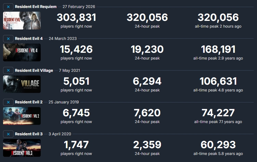 SteamDB verilerine göre Requiem, 320.056 eşleri zamanlı oyuncuya ulaşarak serinin Steam’deki en yüksek zirvesini gördü. Böylece sonuncu sıradaki Resident Evil 4’ün 168.191’lik rekorunu noksan ara farkla geçti. Onu 106.631 oyuncuyla Resident Evil Village, 74.227 ile Resident Evil 2 ve 60.293 ile Resident Evil 3 takip ediyor. Aradaki fark, Requiem’in ne kadar kuvvetlü tek çıkış yaptığını netler biçimde ortaya koyuyor.