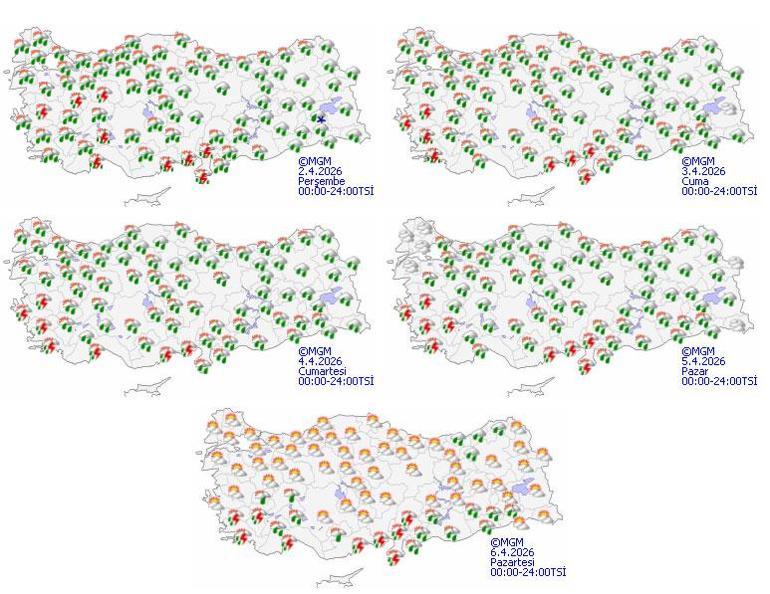 Meteoroloji Genel Müdürlüğü tarafından yapılan oğullar kıymetlendirmelere göre önümüzdeki 24 saat: Ülkemiz genelinin parçalı, mekan yer çeşitlilik bulutlu, Marmara, Ege, Akdeniz, Batı ve Orta Karadeniz, Doğu Karadeniz'in dahili kesimleri, Güneydoğu Anadolu'nun batısı ile Giresun, Trabzon, Erzincan ve Malatya çevrelerinin sağanak ve mekan yer gök gürültülü sağanak yağışlı geçeceği öngörü ediliyor. Yağışların; Güney ve Kıyı Ege, Batı Akdeniz ile Kırklareli, Edirne ve Çanakkale çevrelerinde kuvvetli, Güney Ege kıyıları ile Antalya’nın batıya ilçelerinde çeşitlilik kuvvetli ve mekan yer şiddetlice olması bekleniyor. Batı Akdeniz'in batıya kıyıları ile Ege kıyılarında partikül taşınımı bekleniyor. Doğu Karadeniz'in dahili kesimleri ile Doğu Anadolu'da yüksek kar yağışı örtüsüne malik eğimli alanlarda çığ ve kar yağışı erimesi tehlikesi bulunmaktadır.