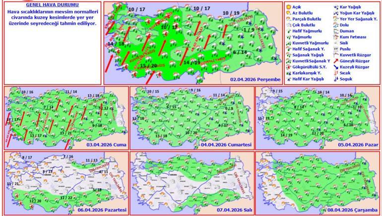 RÜZGAR: Genellikle güneyli yönlerden hafif, ara dizi vasat kuvvette, Marmara’da kuzey ve kuzeydoğu yönlerden kuvvetli (40-60 km/saat), Güney Ege ve Batı Akdeniz’de çeşitlilik kuvvetli ve fırtınalar (60-80 km/saat) şeklinde esmesi bekleniyor.