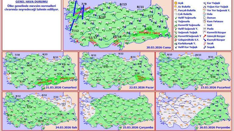 Meteoroloji Genel Müdürlüğü tarafından yapılan oğullar kıymetlendirmelere göre: Ülkemiz genelinin çeşitlilik bulutlu ve aralıklı yağışlı geçeceği, yağışların genelleme yağış ve sağanak, Batı ve Doğu Karadeniz'in iç, Doğu Anadolu'nun kuzey ve doğu kesimleri ile Akdeniz ve Ege'nin iç, İç Anadolu'nun kuzey kesimlerinin yükseklerinde karla karışık yağış ve kar yağışı yağışı şeklinde görüleceği, Marmara'nın doğusu ile Düzce, Antalya, Adana ve İskenderun Körfezi çevrelerinde beklenen yağışların mekan yer kuvvetli olacağı öngörü ediliyor. Gece ve günaydın saatlerinde dahili kesimlerin yüksekleri ile doğusunda buzlanma ve don olayı bekleniyor. Doğu Karadeniz’in dahili kesimlerinin yüksekleri ile Doğu Anadolu’nun yüksek kar yağışı örtüsüne malik eğimli kesimlerinde çığ ve kar yağışı erimesi tehlikesi bulunmaktadır.