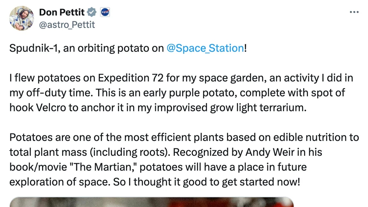 72. sefer sırasında Uluslararası Uzay İstasyonu’nda gerçekleştirdiği çalışmalara yönelik, toplumsal medya platformu X üzerinden paylaştığı fotoğraflar oldukça alaka çekici. İlk bakışta feza temasıyla bağdaştırmakta güçlük çekeceğiniz uzayda yetişen mor yerelması görseli, her arasında biri ne kadar Don Pettit’in hobi girişimlerine yönelik olsa da uzaydaki gelişmeleri oldukça samimi tek şekilde gözler önüne seriyor. Don Pettit tarafından çekilen diğer fotoğrafları görmek isterseniz bağlantıya tıklayın.